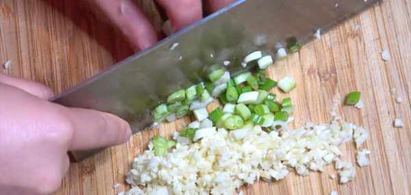 3、準備配菜,幾顆大蒜拍爛之後,剁成蒜蓉,越碎越好,再切一點小蔥。