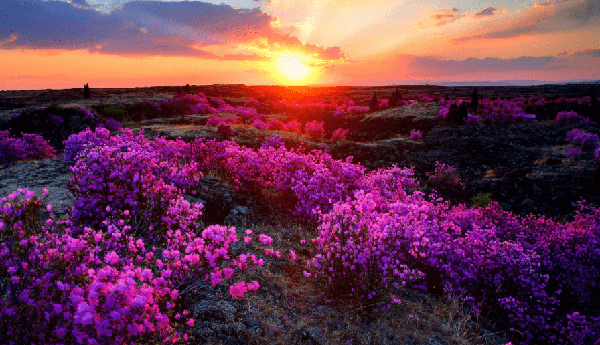 天氣轉暖,牡丹江寧安市沙蘭鎮的熔巖臺地被漫山遍野的達子香裝點,遠遠望去紫紅色達子香如錦似霞,給突兀蒼涼的熔巖臺地註入鮮活的“生命”。