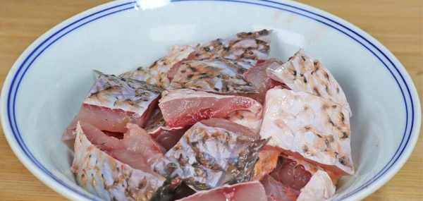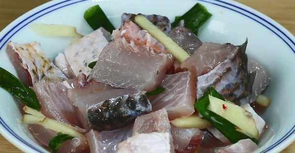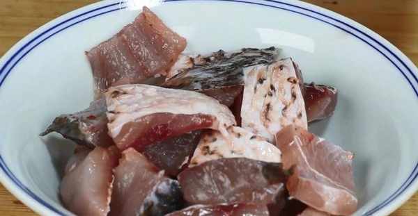 2.現在開始切魚,先把草魚的頭部切掉,再把草魚切成寬度均勻的小段。然後,再把每一個小段切成大小均勻的小塊。切好之後,將草魚塊裝進大碗中備用。魚頭可以裝好,冷凍起來保存,放著以後再吃。