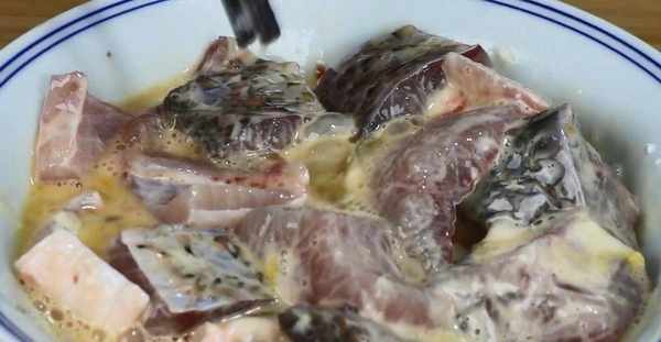 6.等魚肉醃制瞭20分鐘瞭,先把魚肉裡的蔥薑取出來,再把蛋液全部倒進魚肉中,用筷子將它們給翻拌均勻。接著,取出適量的面粉,加入到魚肉中,繼續用筷子翻拌,每一塊魚肉上都裹上面粉。