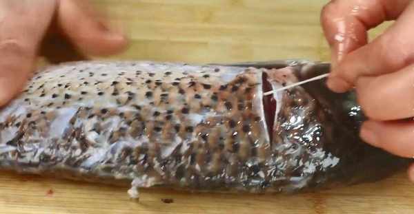 1.首先,購買一條草魚,將草魚的魚鱗和內臟清洗幹凈,然後將草魚的魚鰭和魚尾剪掉。接著,用菜刀在魚鰓的後面割出一條口子,可以看到一個白點,這就是魚腥線。拽住白點慢慢地往外抽,邊拍打魚身邊抽,就可以抽出來瞭。兩邊的魚腥線都要抽掉,這樣做出的魚才不會腥氣。