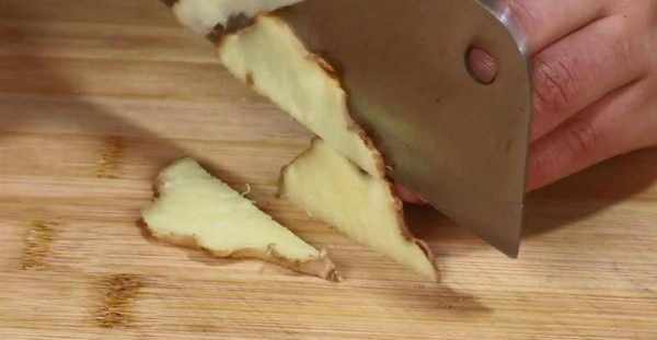 3.取出一塊生薑,先將它放在清水中,用小刷子將生薑表面的泥土清洗幹凈,然後取出來控幹水分。接著,把生薑放在案板上,用菜刀先把它切成生薑片,再把它們切成薑絲。
