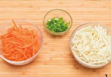 1將茭瓜和胡蘿卜洗凈,分別擦成絲。蔥切成蔥花。