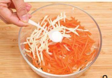 2在碗中放入茭瓜絲、胡蘿卜絲,加鹽、胡椒粉攪拌均勻後醃2分鐘左右。