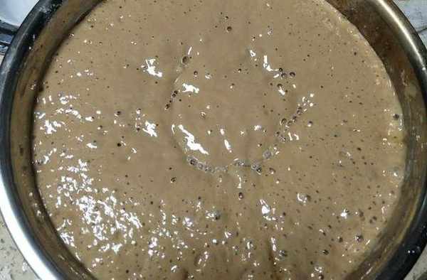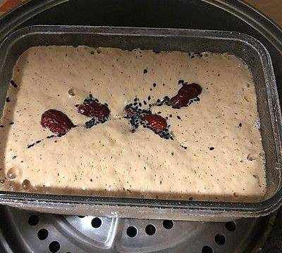 面糊醒發至完全起泡的時候,加入一大把紅棗碎,攪拌均勻到讓它消泡,再倒入盆子裡面二次醒發十五分鐘,經過十五分鐘的醒發,打開蓋子看一下已經滿滿的一盆。鍋裡把水燒開,燒開以後夾上蒸屜,把盆子放到上面,開大火蒸十分鐘,時間到瞭以後,再改成中火再次蒸十五分鐘。