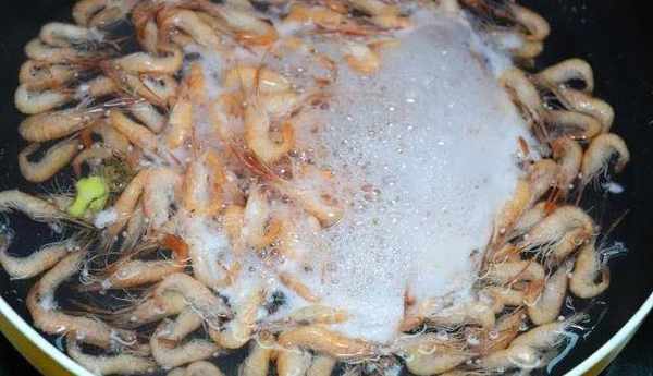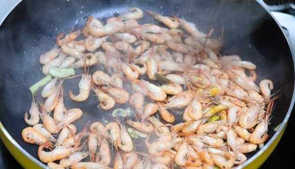 Step1:河蝦洗幹凈放入加瞭水的熱鍋中煮一會兒,待河蝦變成金黃色,水面懸浮瞭大量的泡沫之後把河蝦撈出。河蝦焯水的時候可以滴幾滴白醋和幾片生薑,去腥效果更好。