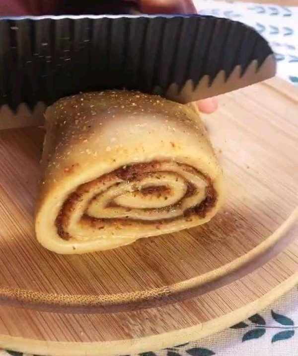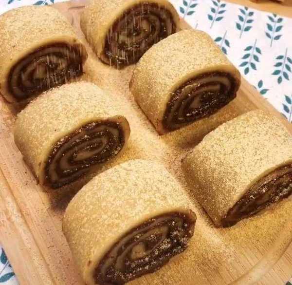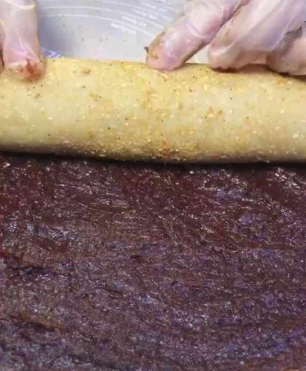 第七步,然後上面鋪上一層紅豆沙餡,紅豆沙餡我是買的現成的,如果朋友們有時間,可以自己做豆沙。均勻塗抹之後,再從一頭卷起來。