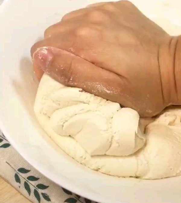 第二步,待紅糖水涼透後,我們來和個面團,碗中放入350克糯米粉,倒入剛剛涼透的紅糖水,用筷子攪拌成面絮狀後,加入10克食用油,然後下手揉成軟一點光滑的糯米團。