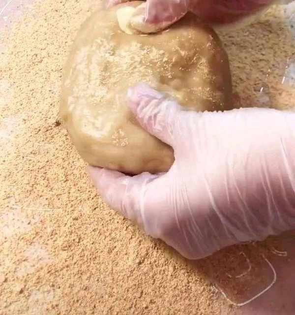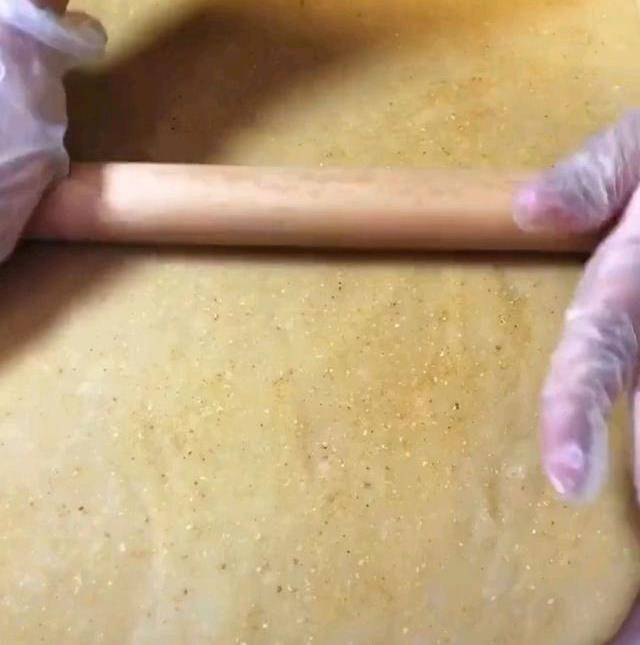 第六步,將剛剛磨好的黃豆面撒在案板上,待蒸熟的糯米團稍微放涼以後。也放在案板上,朋友們現在知道為什麼需要黃豆面瞭嗎?其中一個重要的原因就是防止糯米團黏連。然後用搟面杖搟成長方形面片,註意搟皮的時候不要搟的太薄,稍微厚一點,2~3厘米厚即可。