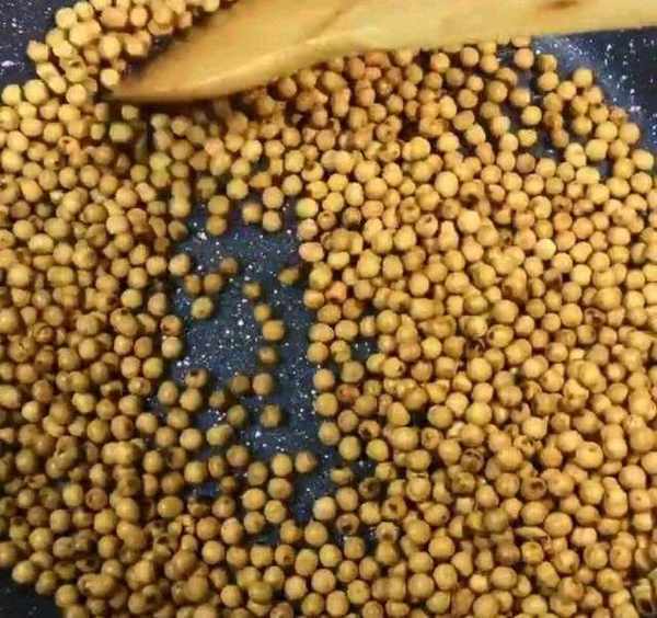 第四步,我們做驢打滾的過程中,還需要用到黃豆面,如果朋友們嫌麻煩可以直接去超市買現成的,我這次是自己做的,主要是傢裡經常喝豆漿,所以傢裡有現成的黃豆!我們準備150克黃豆,提前清洗幹凈晾幹,然後放入鍋中,小火慢慢炒,用鏟子來回不停的翻拌,炒至下面這種狀態,外皮有小黑點瞭,就可以關火瞭。