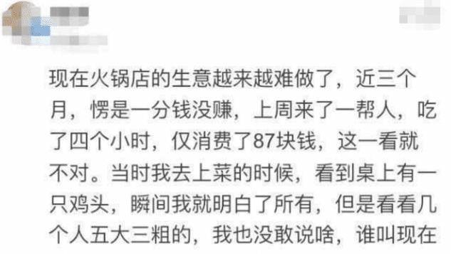 火鍋就是有著龐大受眾群體的一樣美食,因為可以一份菜裡吃到不同的美食,美味的火鍋底料在加上各種各樣的配菜,真的讓火鍋怎麼吃都不覺的膩啊,和朋友聚會吃飯最好的選擇就是火鍋瞭,這就一夥人聚會吃飯去火鍋店,但沒想到的是他們隻點瞭火鍋,8個人吃瞭兩個小時最後結賬隻花瞭87元,老板無奈發帖哭訴!