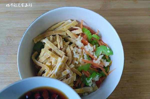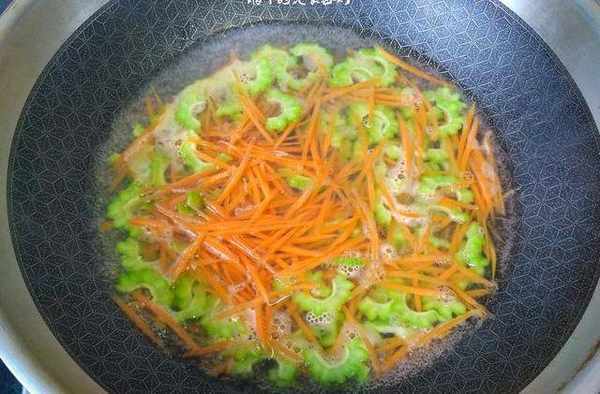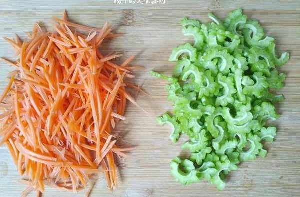 做法:苦瓜對半切開,用勺子刮去苦瓜的瓤,切成薄片,胡蘿卜去皮刨成絲