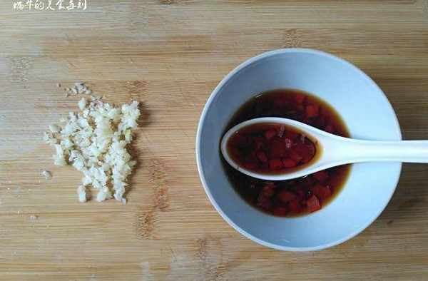 大蒜3瓣切成末,小碗加入一勺生抽,一勺香醋,一勺剁椒,一小勺白糖,兌入2勺溫水,攪拌成醬汁(醬汁根據食材量和自己口味喜好調整)
