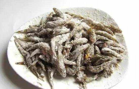 2、在小黃花魚上撒面粉,用手將小黃花魚抖開。盡量讓每一條魚都能與面粉,充分接觸。