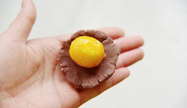 7、然後把面團和豆沙泥分別分割成18個。先用豆沙包裹上咸鴨蛋黃。