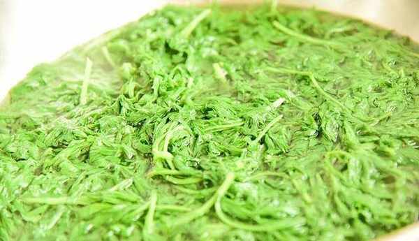 3、接著放入鍋中焯水,並加入少許的小蘇打,這樣能保持艾草的翠綠顏色。