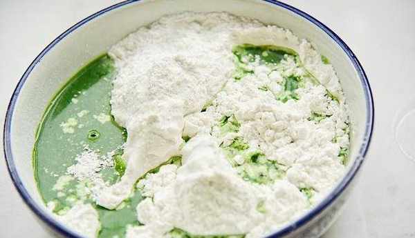 5、然後用紗佈把艾草汁過濾到容器中,加入糯米粉、粘米粉、玉米油、細砂糖混合在一起。