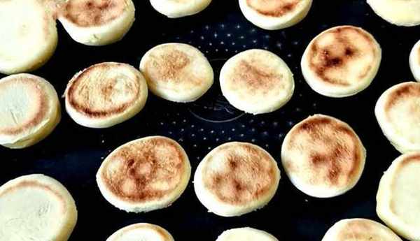 下面用搟面杖搟成一張薄餅,取出一個模具或者是瓶子蓋,壓出生胚,把多餘的面皮揉搓起來,再用模具壓成小饅頭,蓋上一層保鮮膜,進行二次醒發20分鐘。把電餅鐺預熱不要刷油,把生胚均勻地擺放在裡面,然後烙的兩面金黃出鍋,這樣雞蛋小饅頭就做好瞭。