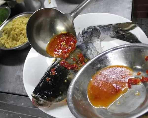 2、黃薑不僅能去腥,而且薑味濃郁,若是直接將黃薑汁淋入魚身,食客第一口吃到的是薑辣味而非鮮辣,而將其與辣椒拌勻後再淋,可以中和薑辣,使味道更柔和。
