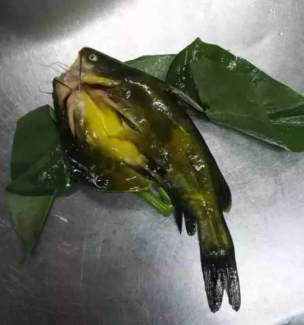 2、將治淨的黃鴨叫擺在漏勺上,浸入加有少許鹽的沸水中燙2分鐘至魚皮開裂,此時魚肉約九分熟,撈出瀝水後整齊擺放在墊有洋葱片、紫蘇葉的鐵鍋中,淋跳水魚汁200克,撒香菜少許,帶卡式爐上桌即成。