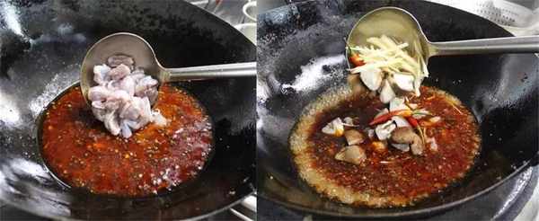 2、鍋入菜籽油60克燒至五成熱,下入青花椒15克、川老匯鮮辣瓣45克(以辣椒、豆瓣醃制而成,顏色紅亮,香辣味較濃,可以用紅油豆瓣加少許泡椒混勻代替)炒香,放辣椒面20克、薑碎、蒜碎各25克炒勻,添入清水800克,加少許鹽、雞粉調味。
