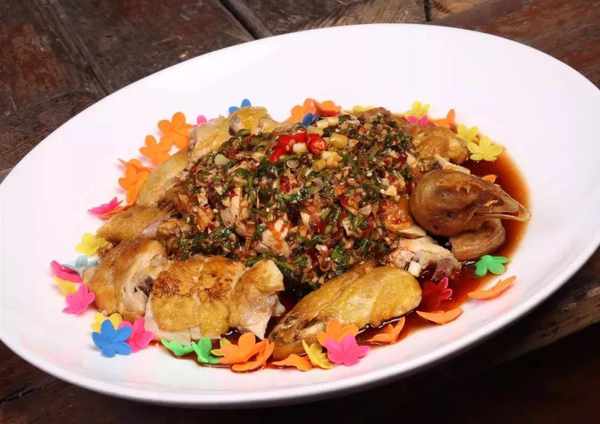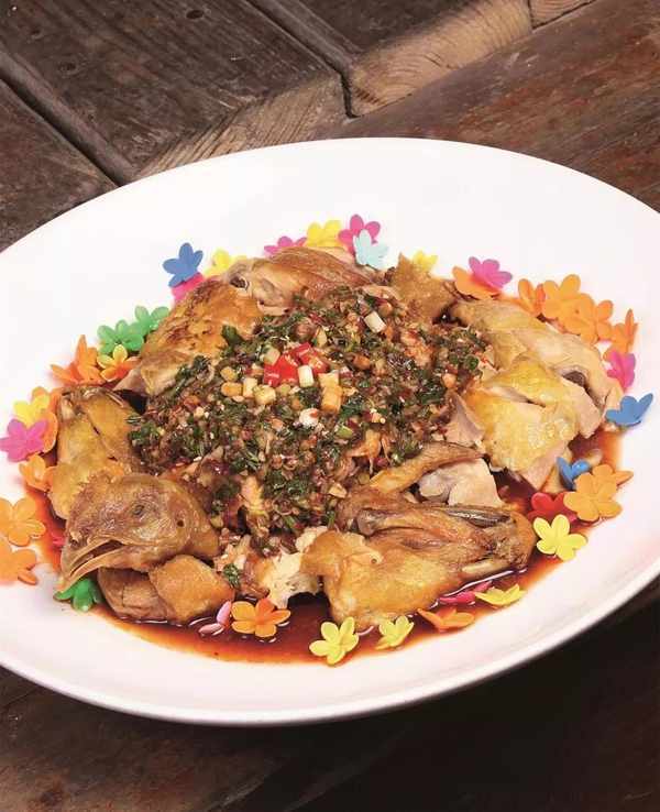 此菜根據四川名菜"油淋雞"改良而來,選用仔雞入菜,經過醃、蒸、炸三步制熟,最後斬塊、裝盤,澆入提前調好的鮮椒料汁,雞皮脆香、雞肉細嫩、料汁鮮辣,是道極美味的熱拌菜肴。