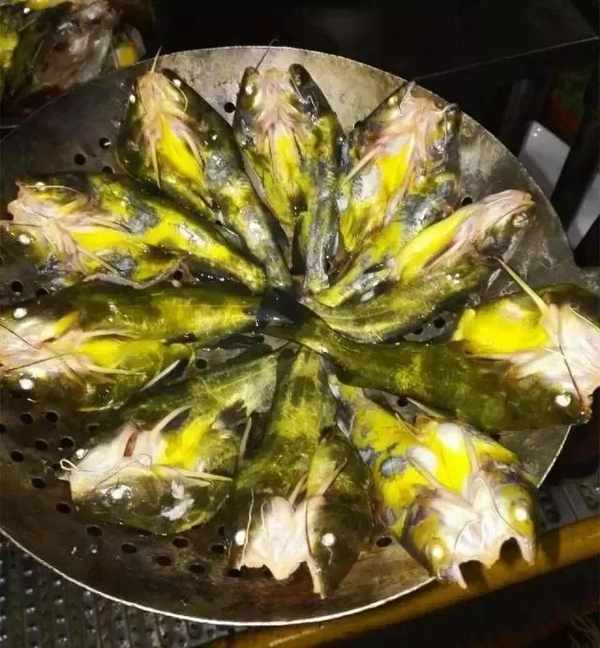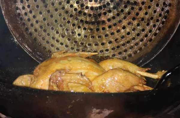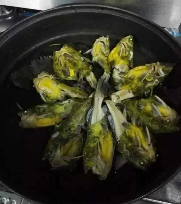 2、黃鴨叫腹部朝上,均勻擺放在漏勺裏。