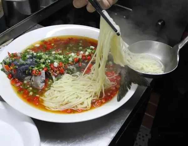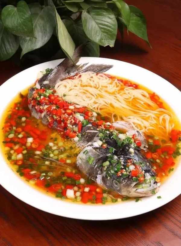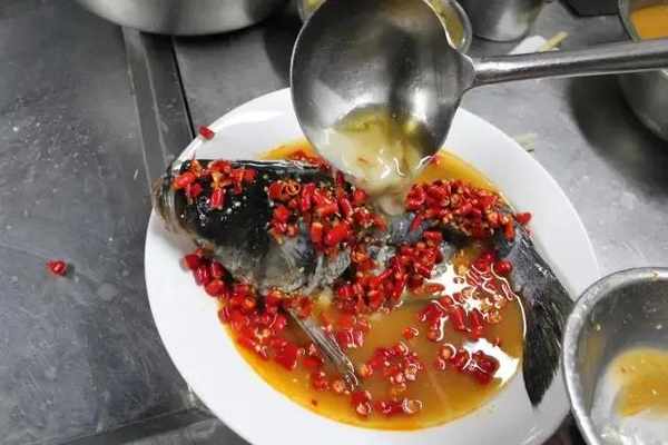 花鰱在盤中擺成曲線造型,用黃薑汁水浸透剁辣椒和小米椒,再分別澆淋魚身使其徹底入味,覆膜蒸熟即可上桌,走菜迅速快捷、口感鮮嫩麻辣。
