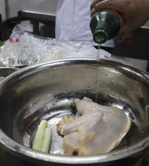 1、仔公雞(重約1斤/只)宰殺治淨,斬掉爪子,從脖與胸的連接處開口,扯掉喉管,再從屁股開口掏淨內臟,沖去血水,納盆加鹽、葱段、薑塊(拍破)、料酒,不斷揉搓表皮和腹腔,使其充分去腥、入味。
