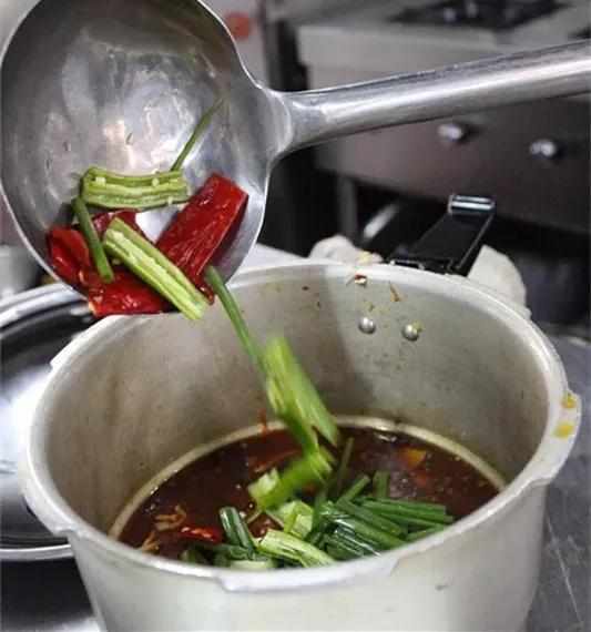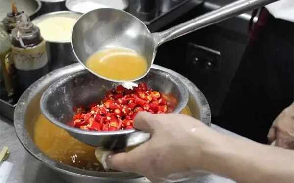 鍋入紅油3斤燒至四成熱,下入蒜末1000克、薑末300克小火煸香,倒入辣妹子醬1500克、野山椒碎、小米辣圈、洋葱末各1000克、黃燈籠椒醬750克、芹菜粒500克,開中火炒出香味,沖入猪棒骨湯20斤,調入味精100克、蚝油、李錦記蒸魚豉油各75克、鮮味寶調味料、孜然粉、自磨花椒碎各50克、十三香30克大火燒開,淋入生抽80克、花椒油30克轉小火熬15分鐘即成。