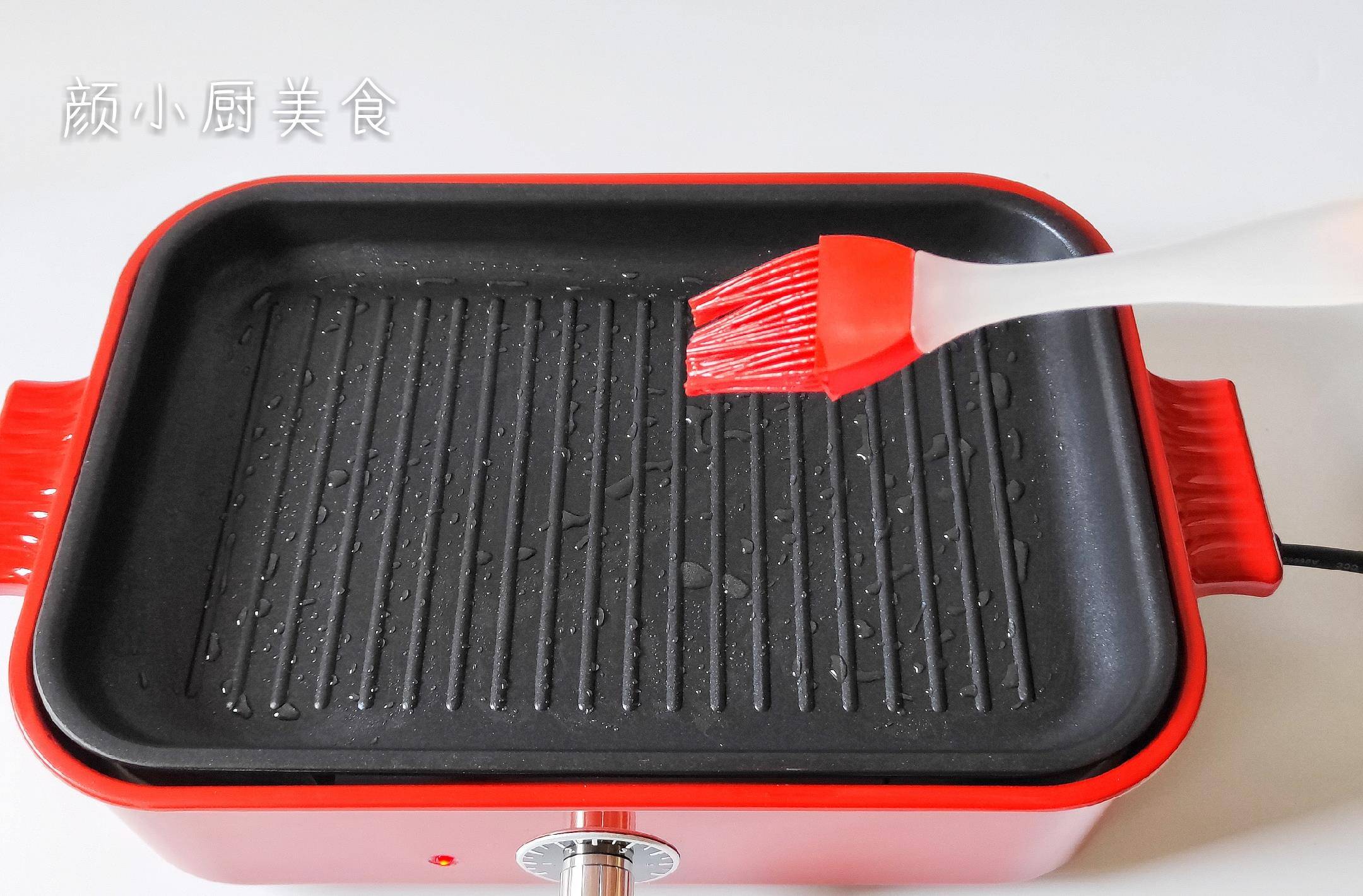 第四步:煎盤插上電源,按鈕調2檔預熱一下,插上電源很快就熱瞭,然後用刷子刷上食用油。