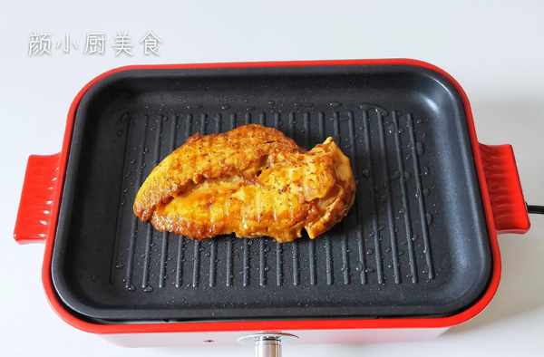 第五步:把醃制好的雞排放入煎盤中煎,煎至底部金黃色。