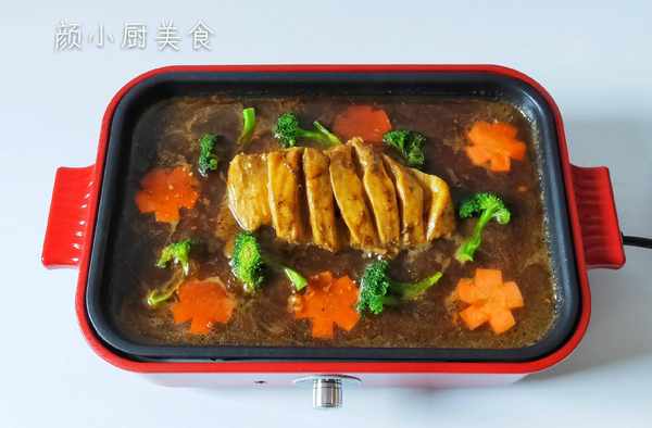 第八步:煮開後,煮至快收汁時放入紅蘿卜片,西藍花煮熟,即可關火出鍋,一道簡單美味的黑胡椒雞排就做好瞭。