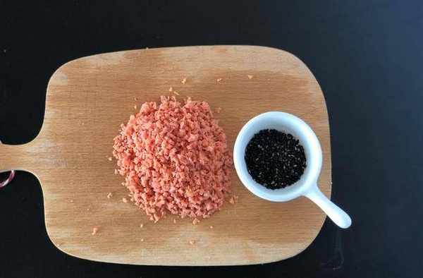 2.火腿切成細細碎碎的備用,準備一點熟黑芝麻