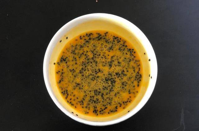 3.將黑芝麻放入裝有蛋黃的小碗中,充分攪拌均勻