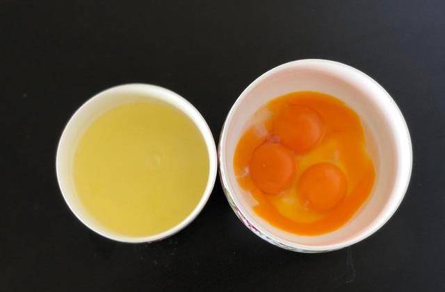1.準備食材,一個全蛋和三個蛋黃打入一個碗中,剩餘的三個雞蛋清打入另一小碗