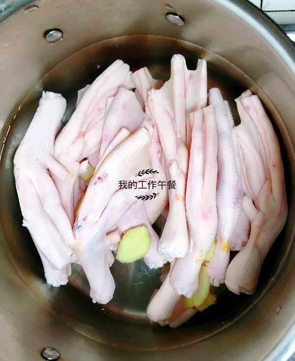 第二步:鍋中放入清水,把鴨腳焯一下水,放點料酒和薑片去腥,煮沸騰再撈起來清洗幹凈。