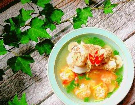 第二個想要介紹給大傢的美食就是腿骨蘑菇鮮蝦湯,湯鮮蝦美味,好喝不膩,讓你大飽口福