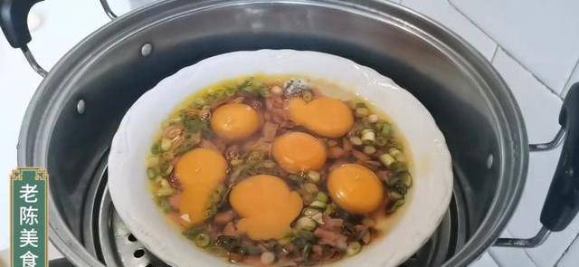 在盤中打入六顆土雞蛋,放入蒸鍋開火蒸十五分鐘,蒸熟即可。