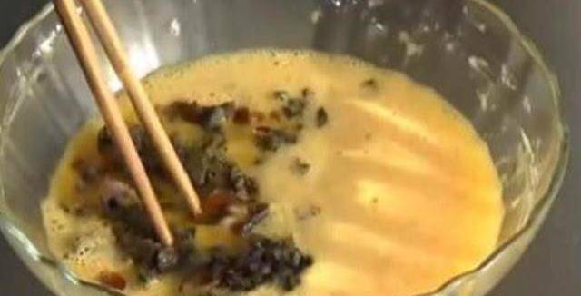 3、把兩個皮蛋剝去外殼,用刀切碎,放入雞蛋液中,攪拌均勻。