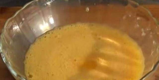4、準備一個耐高溫的容器,裡面刷一層食用油,再倒入雞蛋液。用小勺子撇去雞蛋液表面的那層浮沫