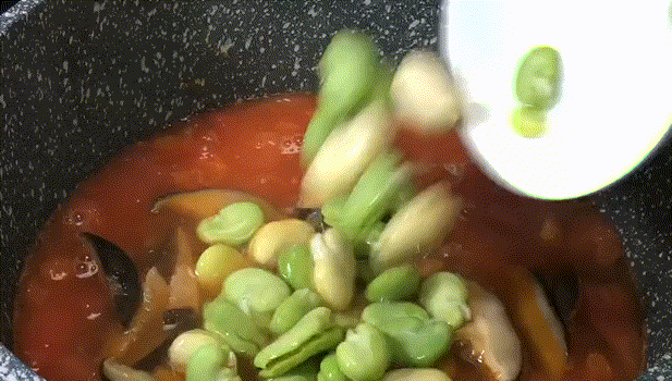 5.放入蠶豆攪拌均勻,中火煮開。