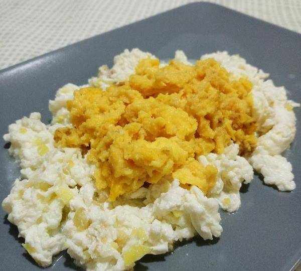 3、 鍋中放油,油熱以後先炒蛋白,不要炒太久,蛋白稍一成型就放入一半調好的料汁,然後出鍋放入盤中,接著再用同樣的方法來炒蛋黃,也是一成型就放入剩下的料汁,然後出鍋放到炒的蛋白的上面,開吃吧,看看跟真螃蟹的味道有什麼不同。