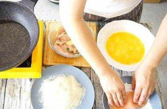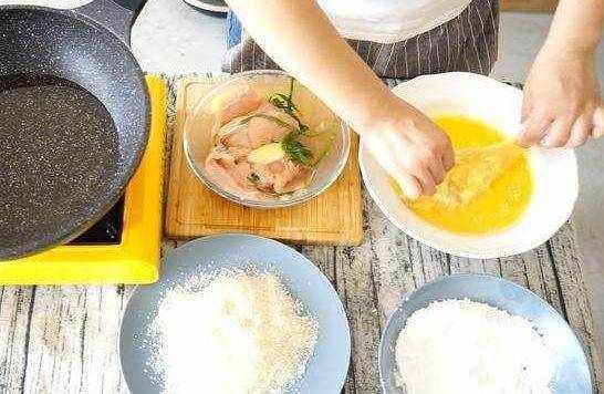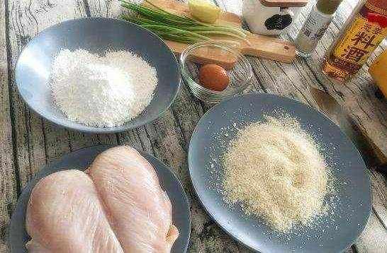 做法:雞脯肉洗凈。面包糠、淀粉各裝一個盤內,雞蛋也磕碗裡,用筷子攪拌均勻備用。