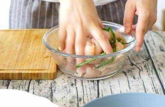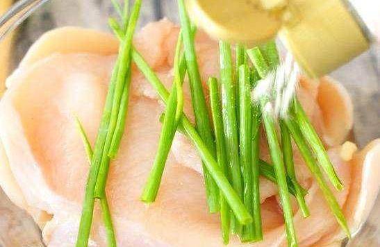 雞脯肉片好以後,加蔥、薑、料酒、鹽、白胡椒粉醃制一下。