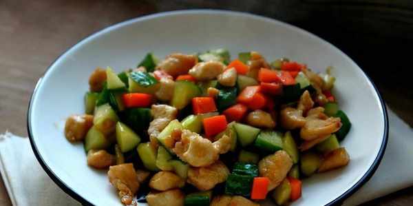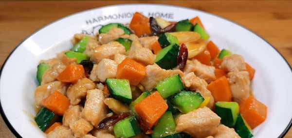 起鍋燒油,油熱之後將雞胸肉放進去,炒至變色後盛出,另起鍋燒油,將蔥薑蒜放進去炒香之後,再把黃瓜和胡蘿卜放進去,翻炒均勻,然後再把雞胸肉放進去,加點食鹽,生抽,雞精來調味,翻炒均勻,最後在加點淀粉打個薄芡,開大火收個湯汁就好瞭。