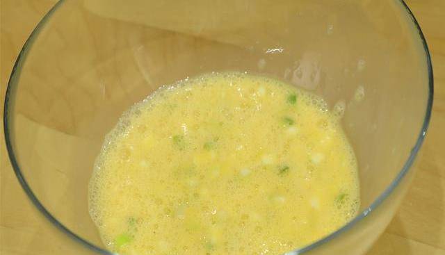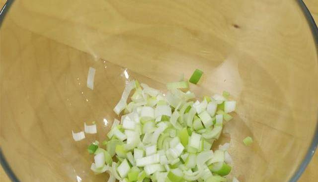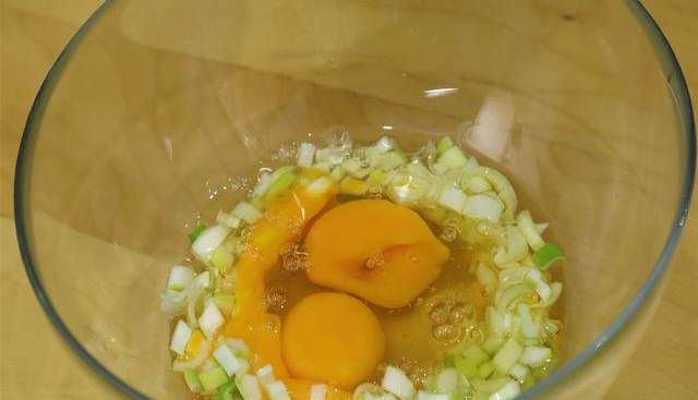 3.蔥花切好後,放入大碗裡打入兩顆雞蛋,少放一點鹽。
