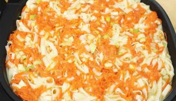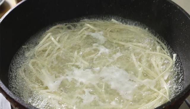 6.鍋中燒水把胡蘿卜放鍋裡焯一下,然後撈出過涼水,再攥幹水分。