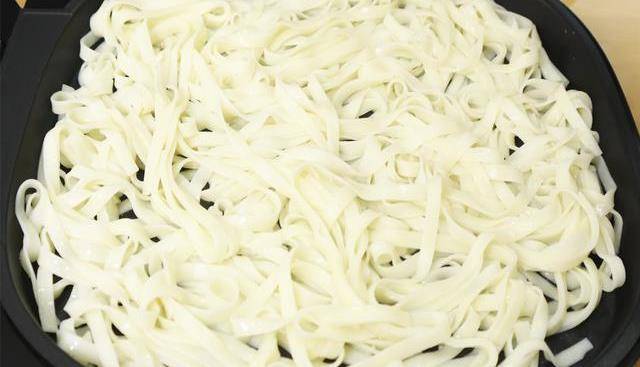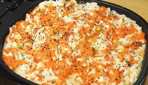 11.電餅鐺預熱,然後放少許花生油,刷均勻,放面條均勻的鋪在鍋裡,把它攤平。