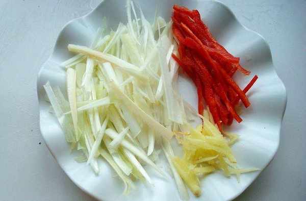 3、大蔥、薑、洗凈切片和切蔥絲,紅辣椒洗凈切絲
